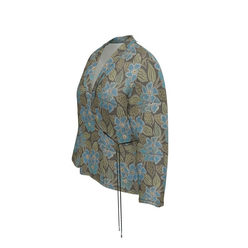 This wrap blazer features a shawl collar with plaid accents and twin ties at the waist. The Crushed Velour fabric adds a luxurious feel. Available in XXS to 2XL and is an ideal alternative to a suit jacket. An excellent complimentary piece with our denim skirts.
